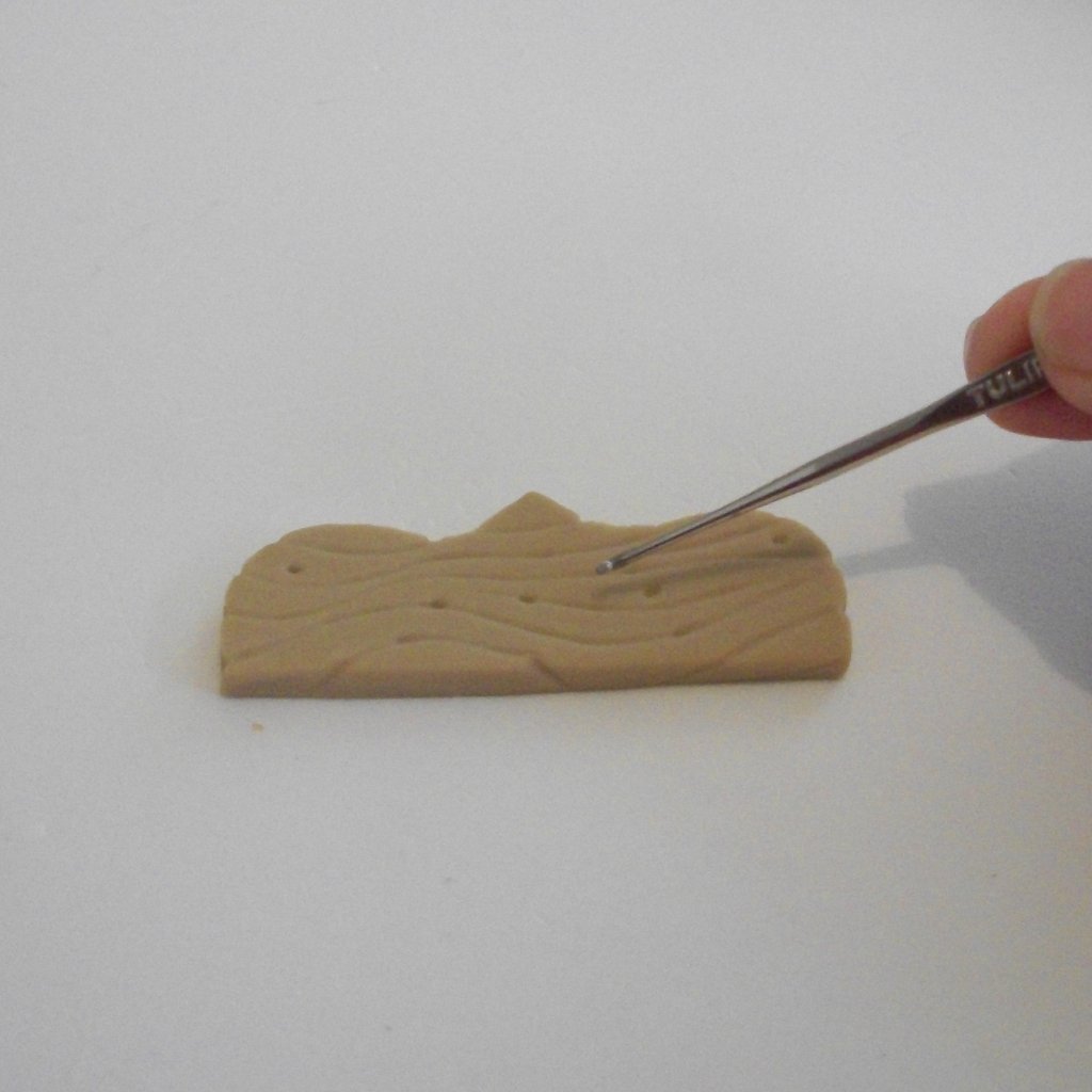 Com uma agulha de crochê faça ranhuras imitando veios de madeira.